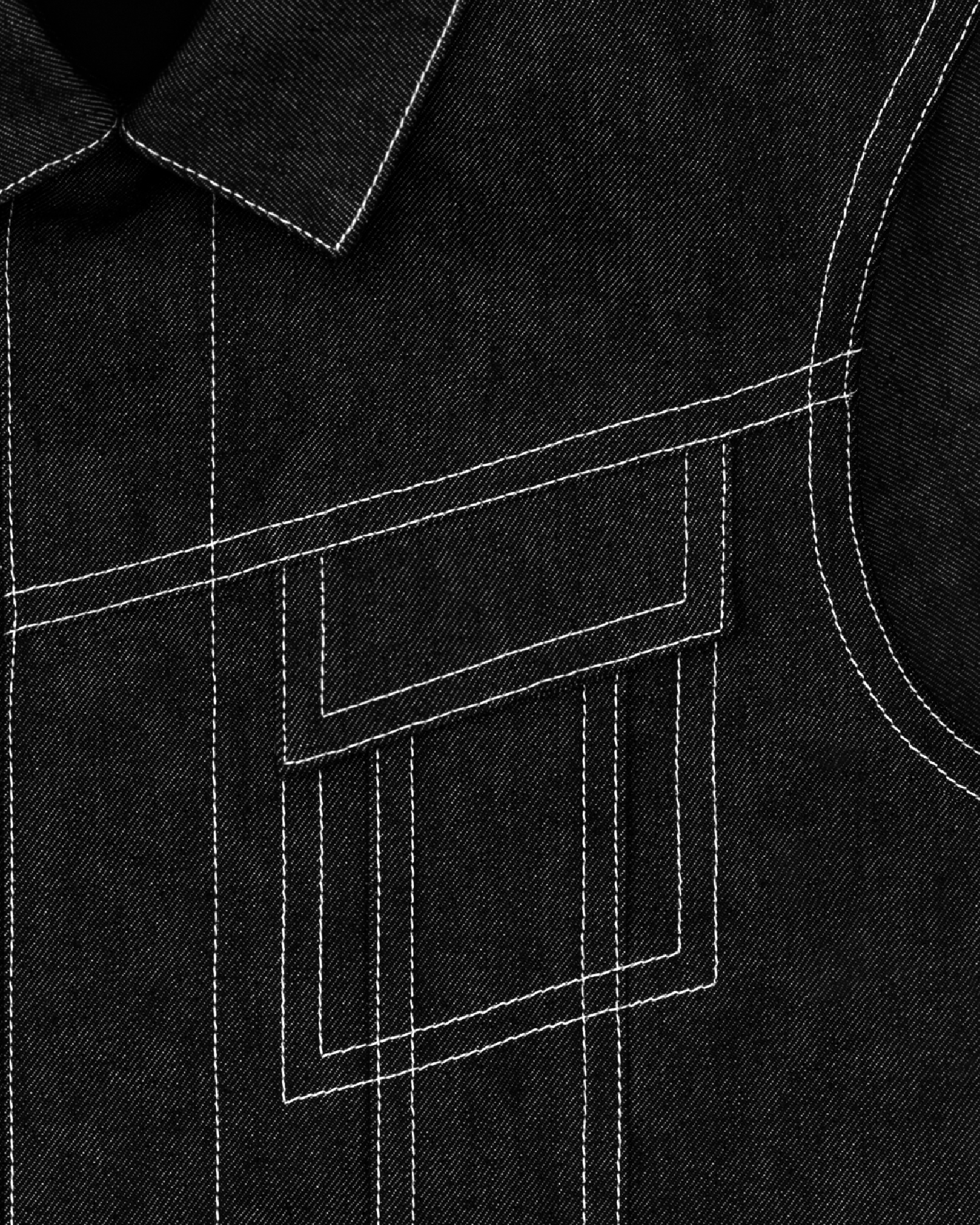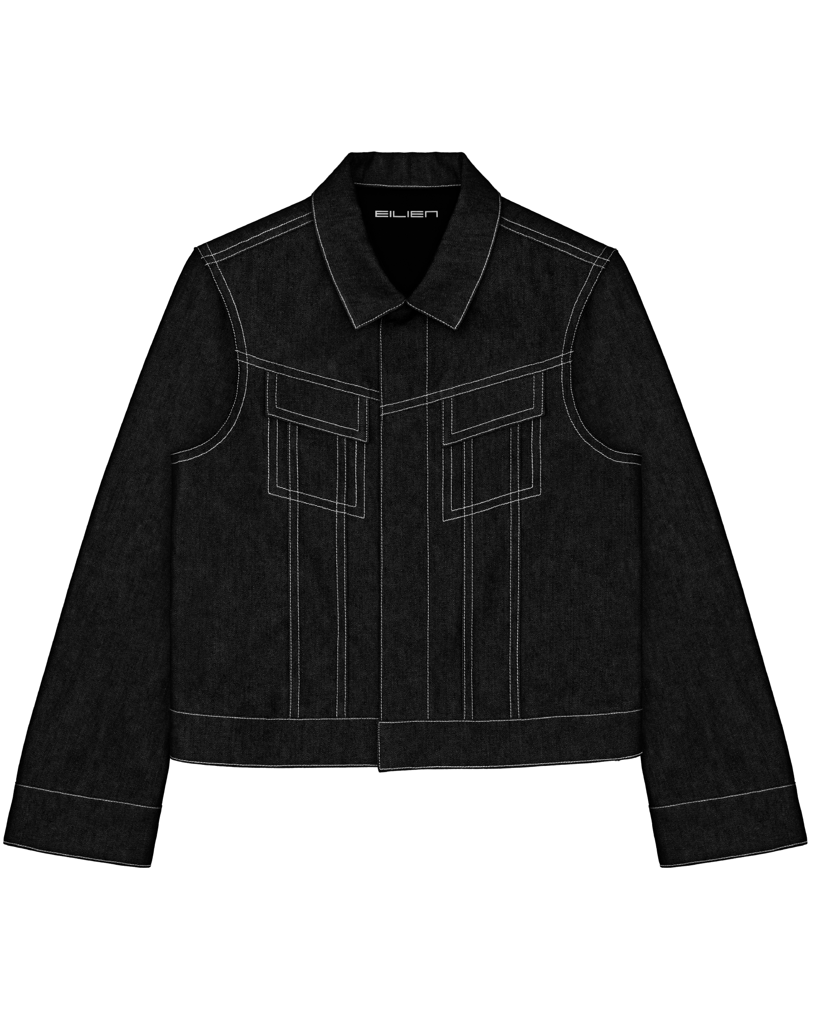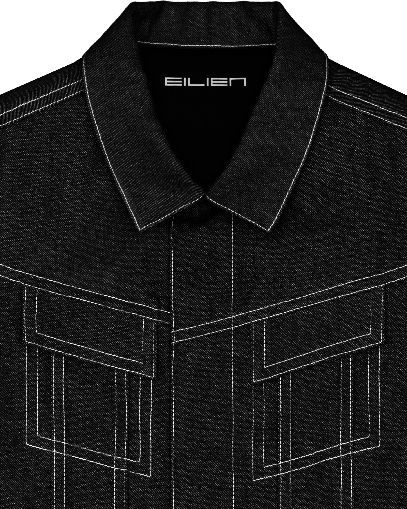 sharp, angular seams; wide contrast topstitching; slanted front yoke and chest pocket detailing; convertible collar; hidden button closure at center front and cuffs; metal hardware (antique silver finish) throughout: hollow shank buttons at center front and cuffs; rivets on sleeves and back waistband; interior chest and hip pockets; EILIEN nameplate pin included.