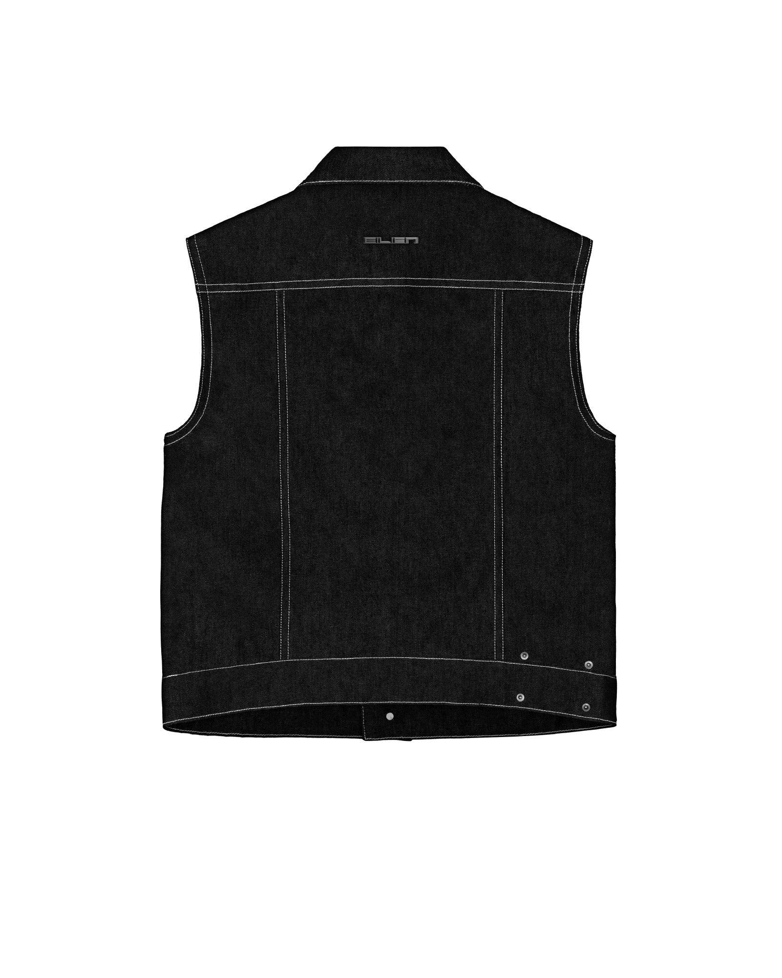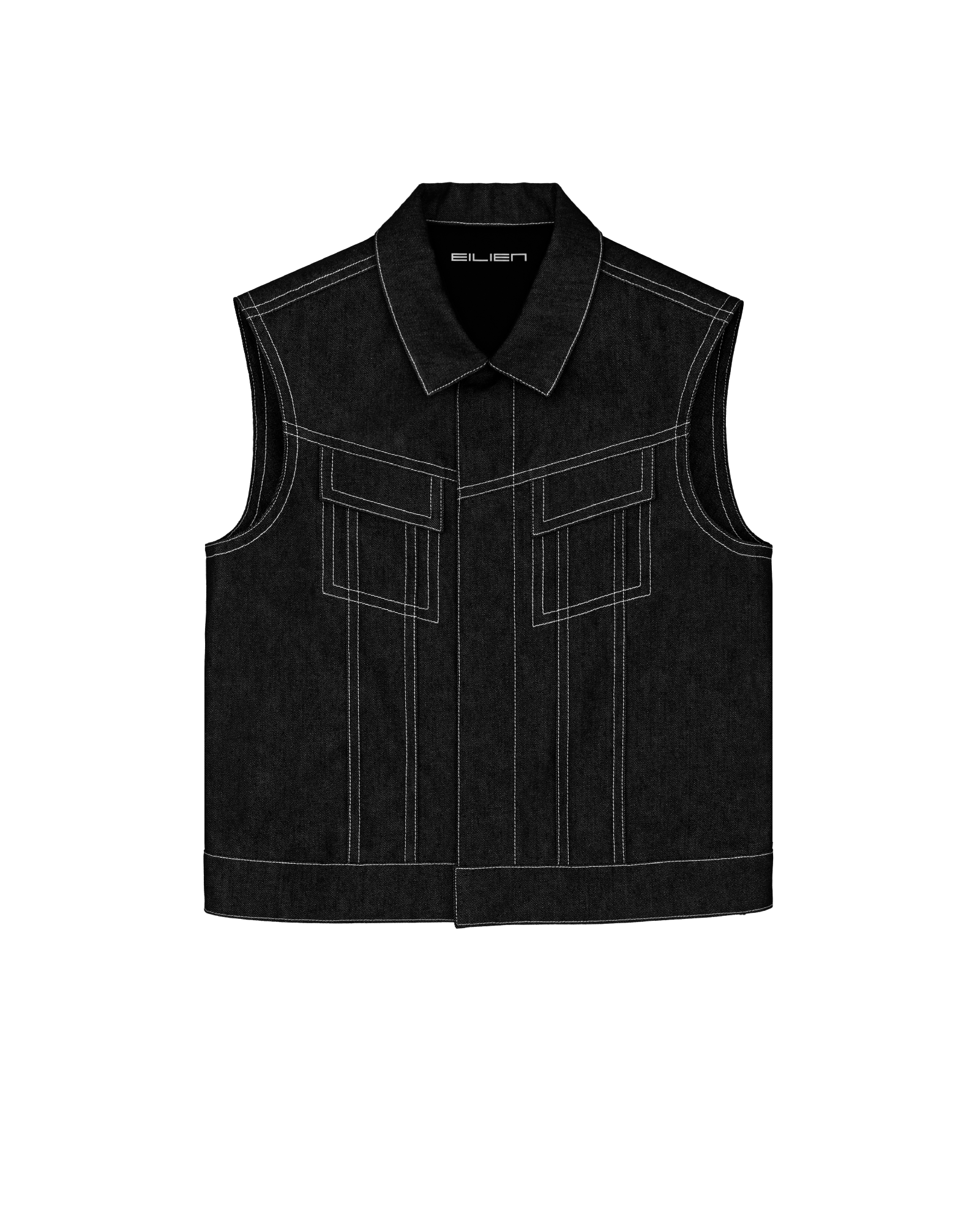 sharp, angular seams; wide contrast topstitching; slanted front yoke and chest pocket detailing; convertible collar; hidden button closure at center front; metal hardware (antique silver finish) throughout: hollow shank buttons at center front; rivets on back waistband; interior chest and hip pockets; EILIEN nameplate pin included.