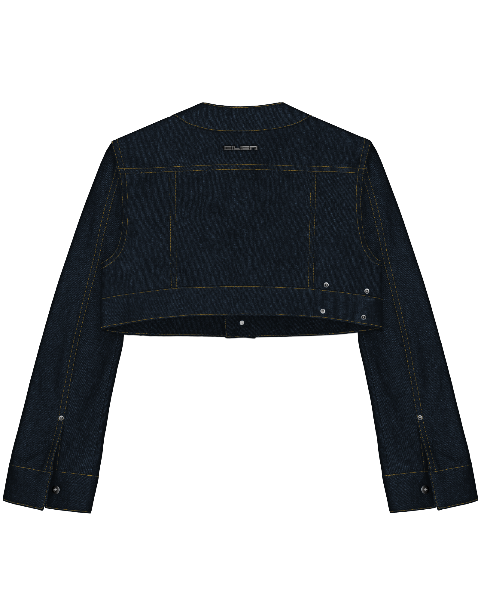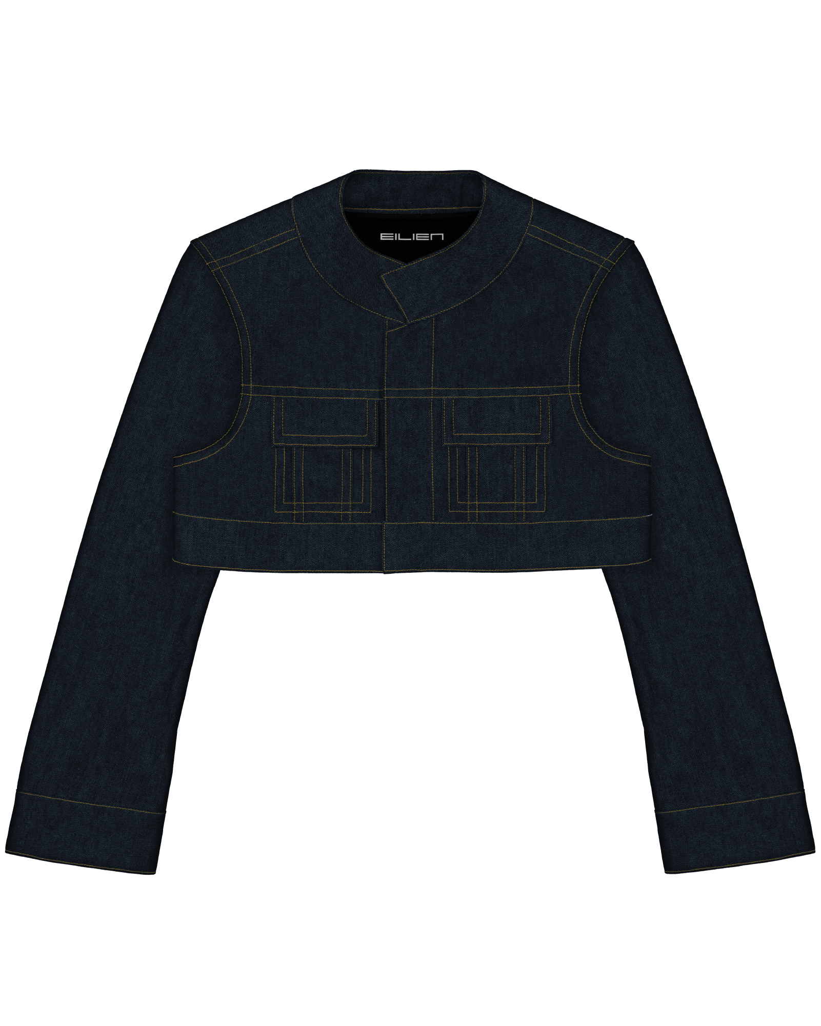 sharp, angular seams; wide contrast topstitching; perpendicular front yoke and chest pocket detailing; convertible collar; hidden button closure at center front and cuffs; metal hardware (antique silver finish) throughout: hollow shank buttons at center front and cuffs; rivets on sleeves and back waistband; interior chest and hip pockets; EILIEN nameplate pin included.