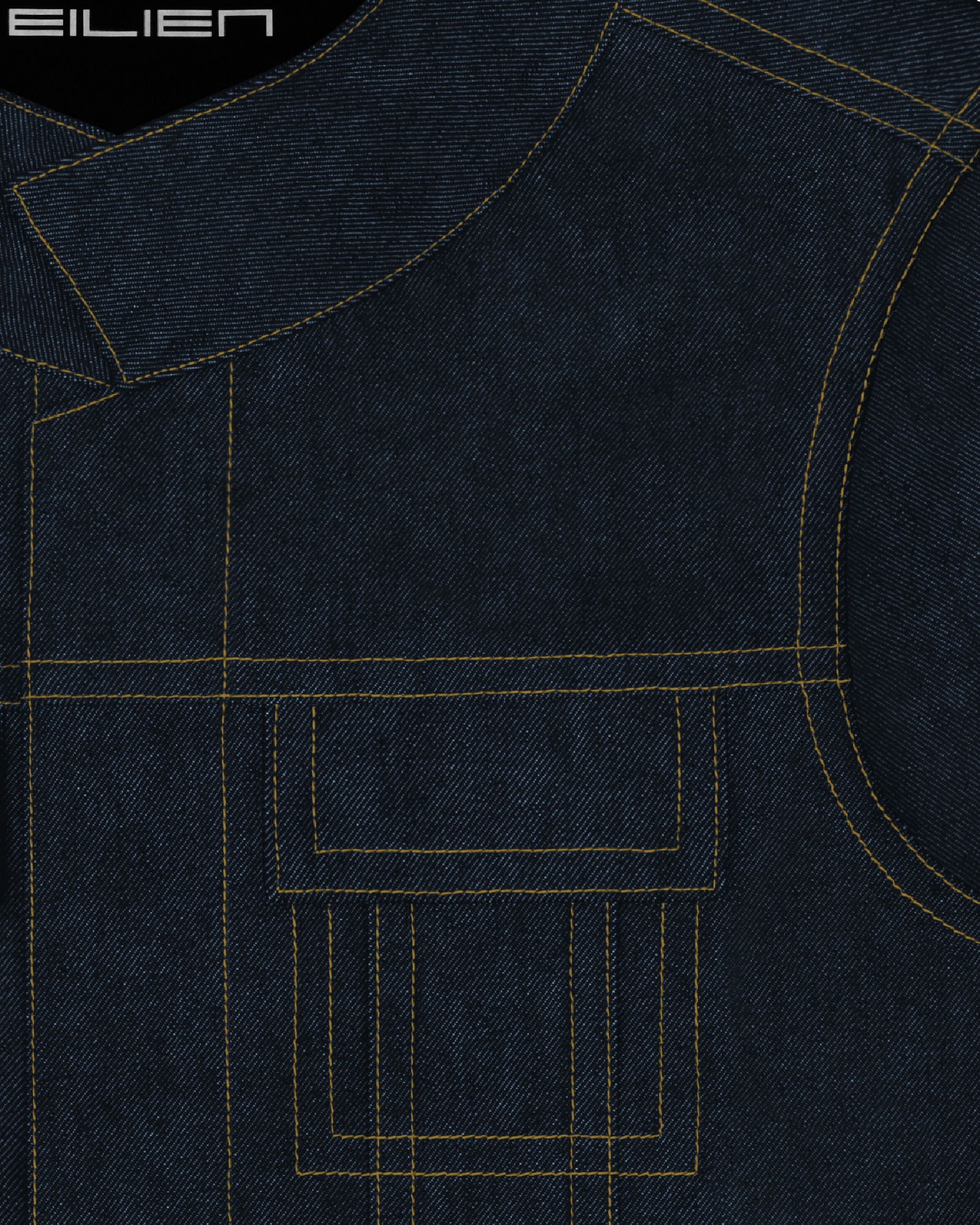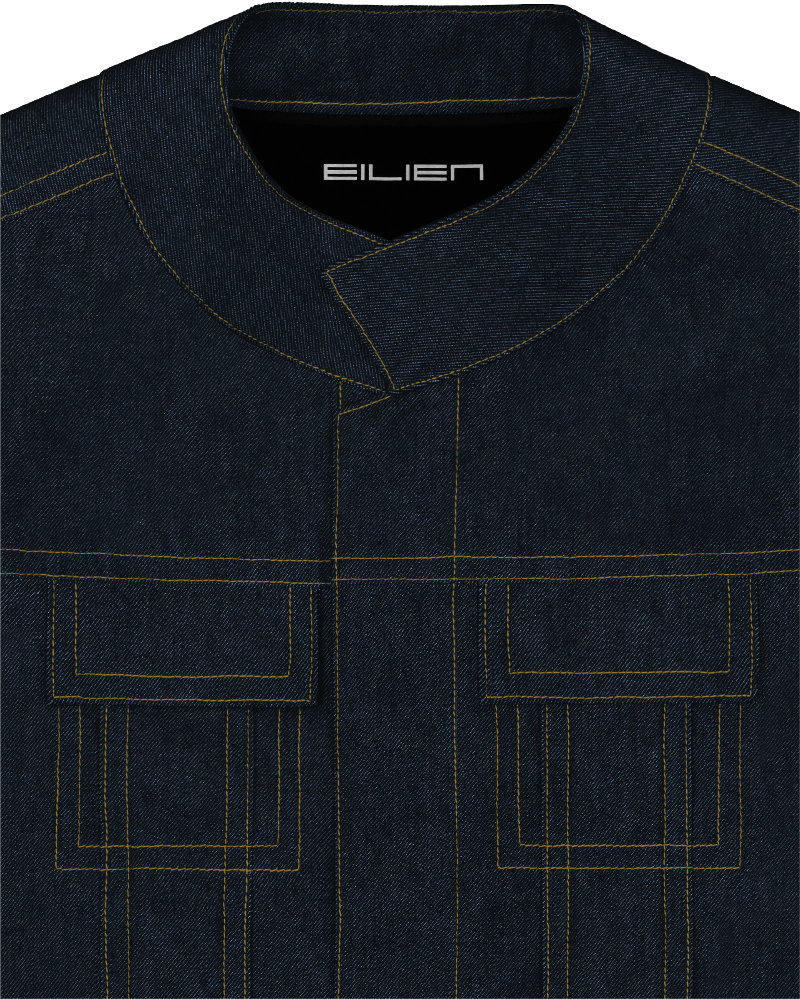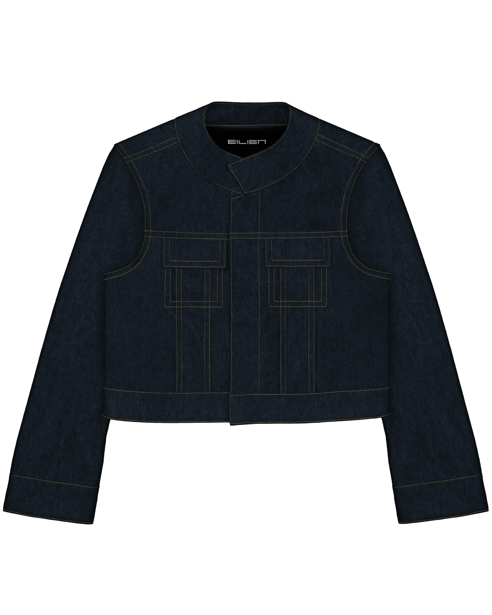 sharp, angular seams; wide contrast topstitching; perpendicular front yoke and chest pocket detailing; convertible collar; hidden button closure at center front and cuffs; metal hardware (antique silver finish) throughout: hollow shank buttons at center front and cuffs; rivets on sleeves and back waistband; interior chest and hip pockets; EILIEN nameplate pin included.