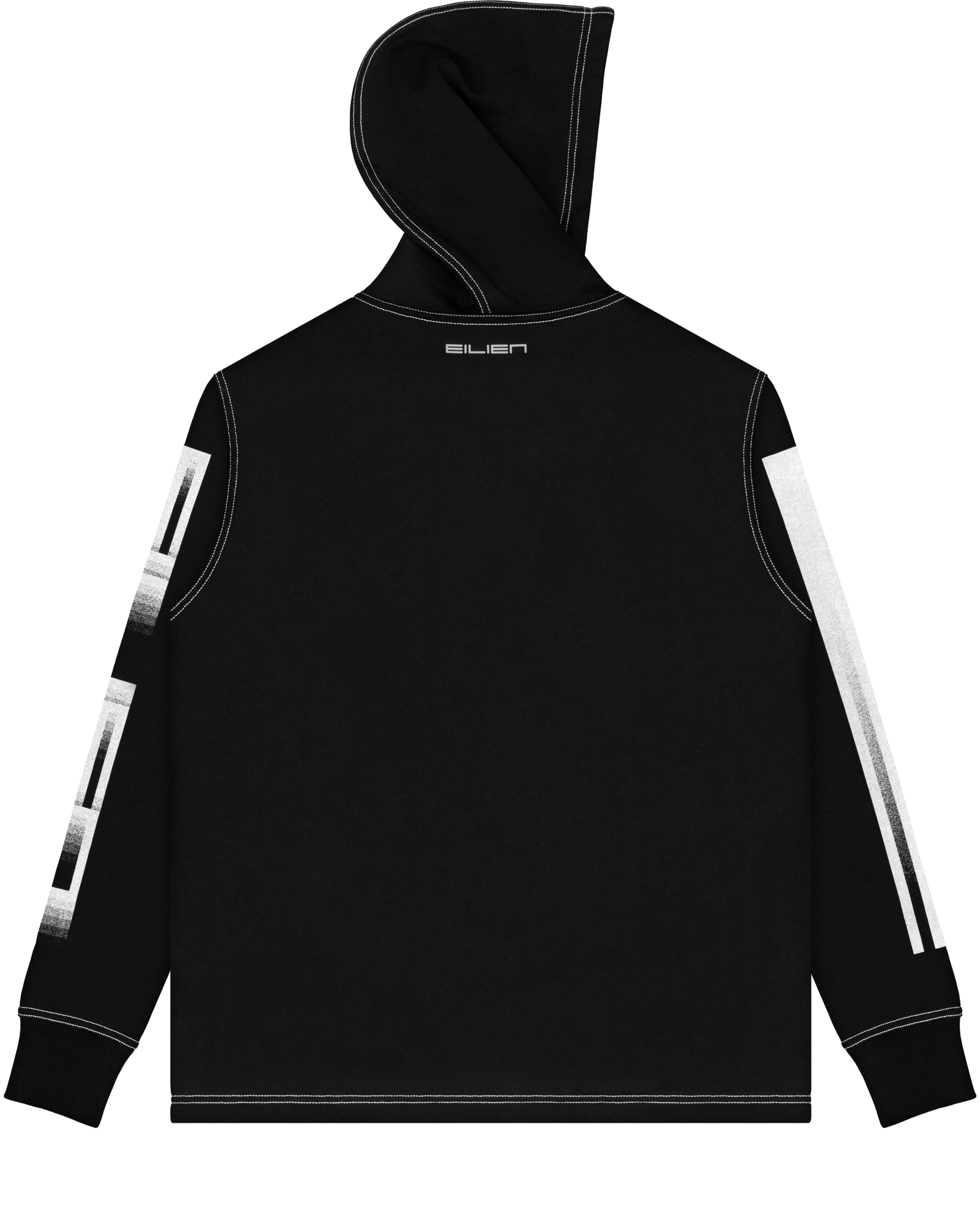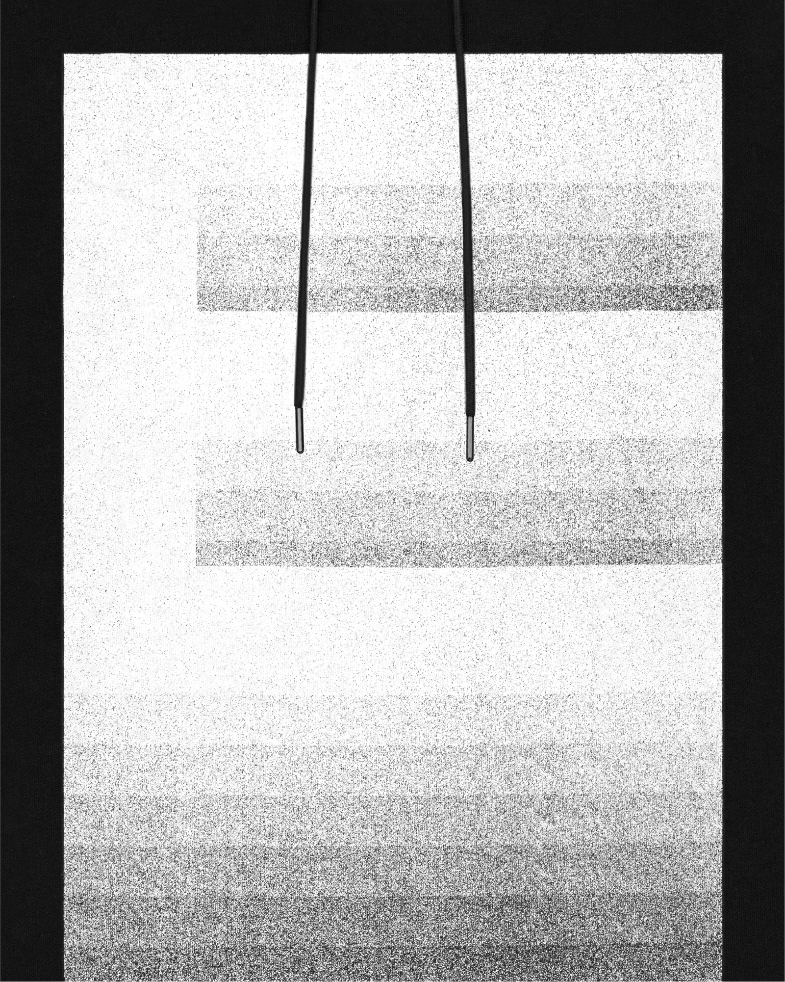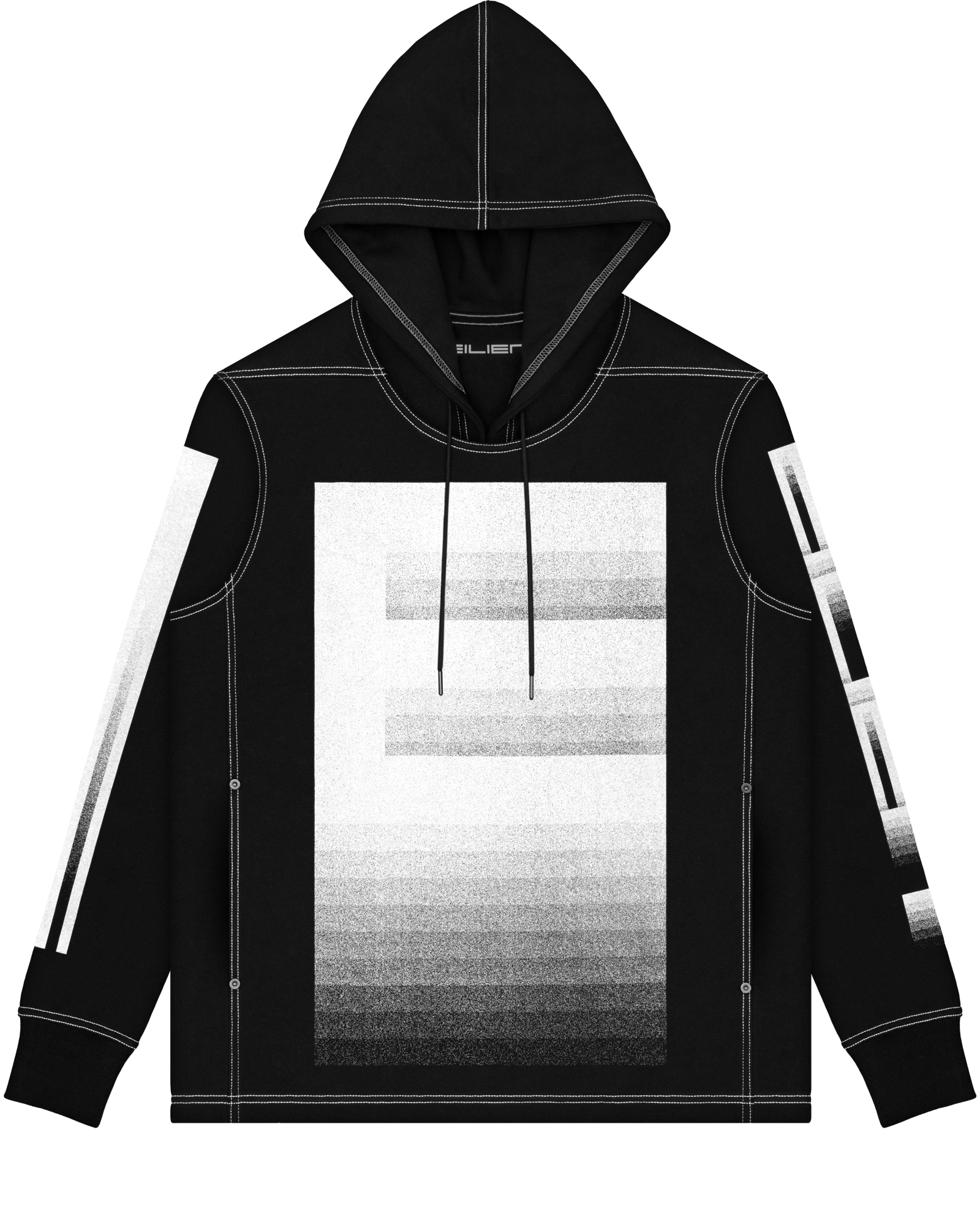 horizontal shoulder seams and offset side seams create a framework for graphic prints; contrast topstitching; lined hood with center seam and drawstring tunnel; hidden inseam pocket in front, long sleeves with rib knit cuffs; loose body with plain hem (no ribbing); metal hardware (antique silver finish) throughout: eyelets on hood; aglets on drawstrings; rivets on pocket opening; matte screen print.