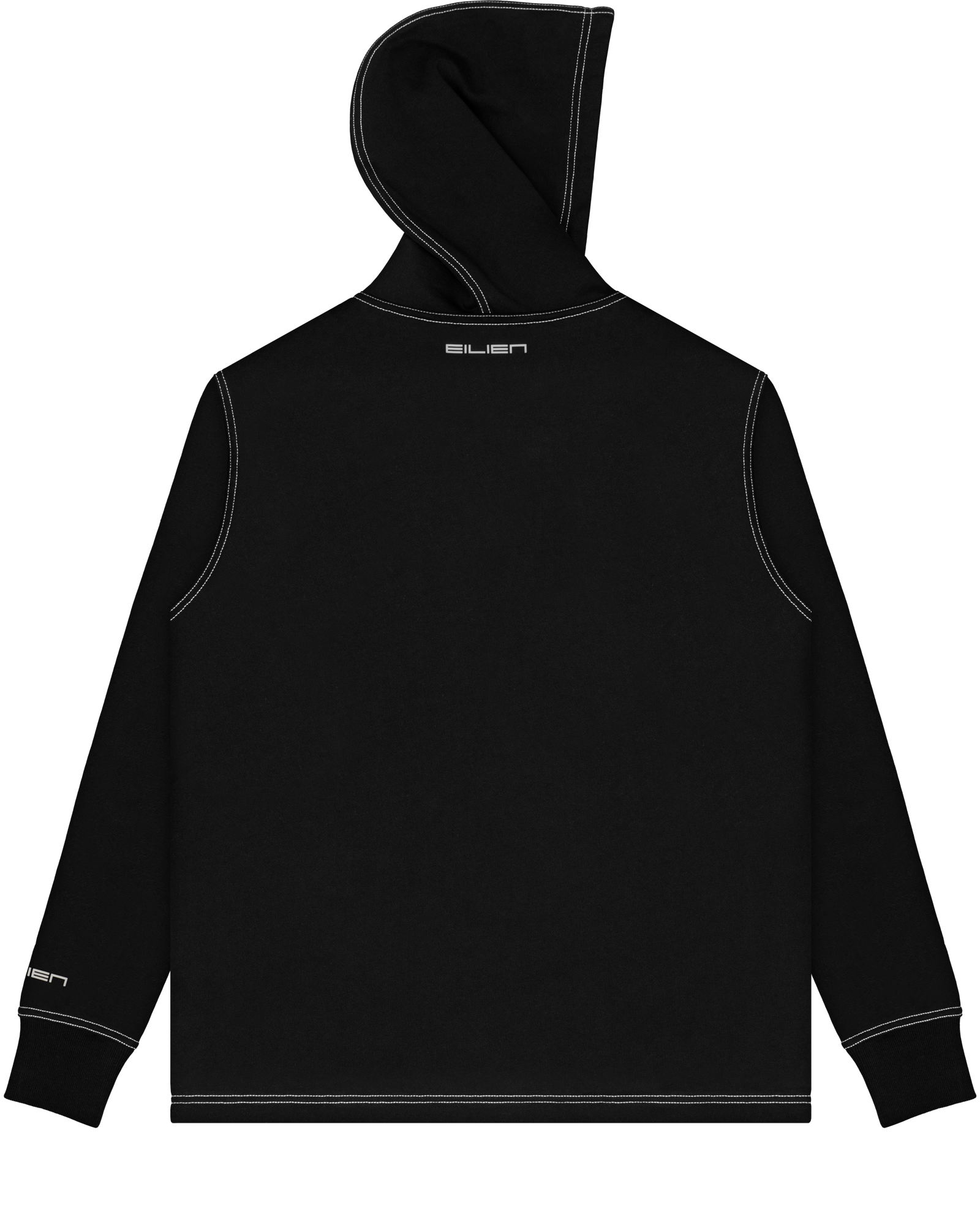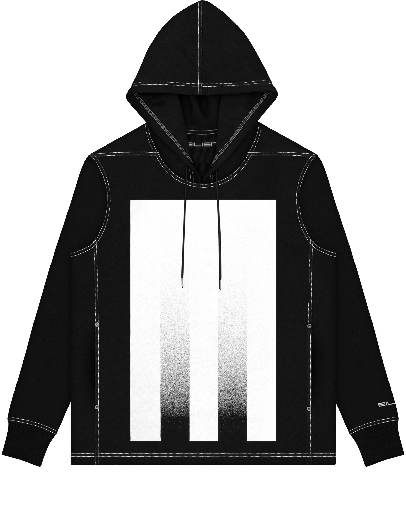 horizontal shoulder seams and offset side seams create a framework for graphic prints; contrast topstitching; lined hood with center seam and drawstring tunnel; hidden inseam pocket in front, long sleeves with rib knit cuffs; loose body with plain hem (no ribbing); metal hardware (antique silver finish) throughout: eyelets on hood; aglets on drawstrings; rivets on pocket opening; matte screen print.