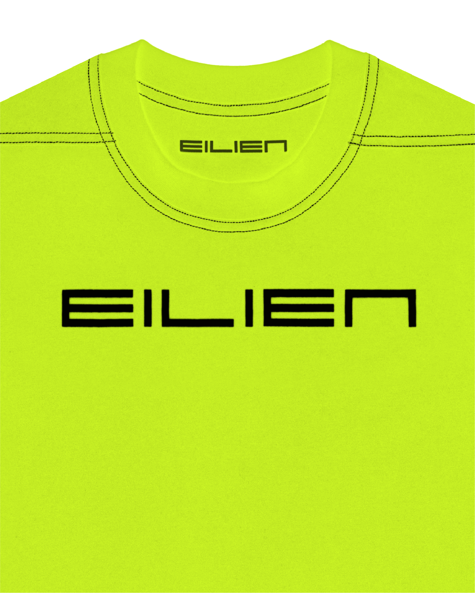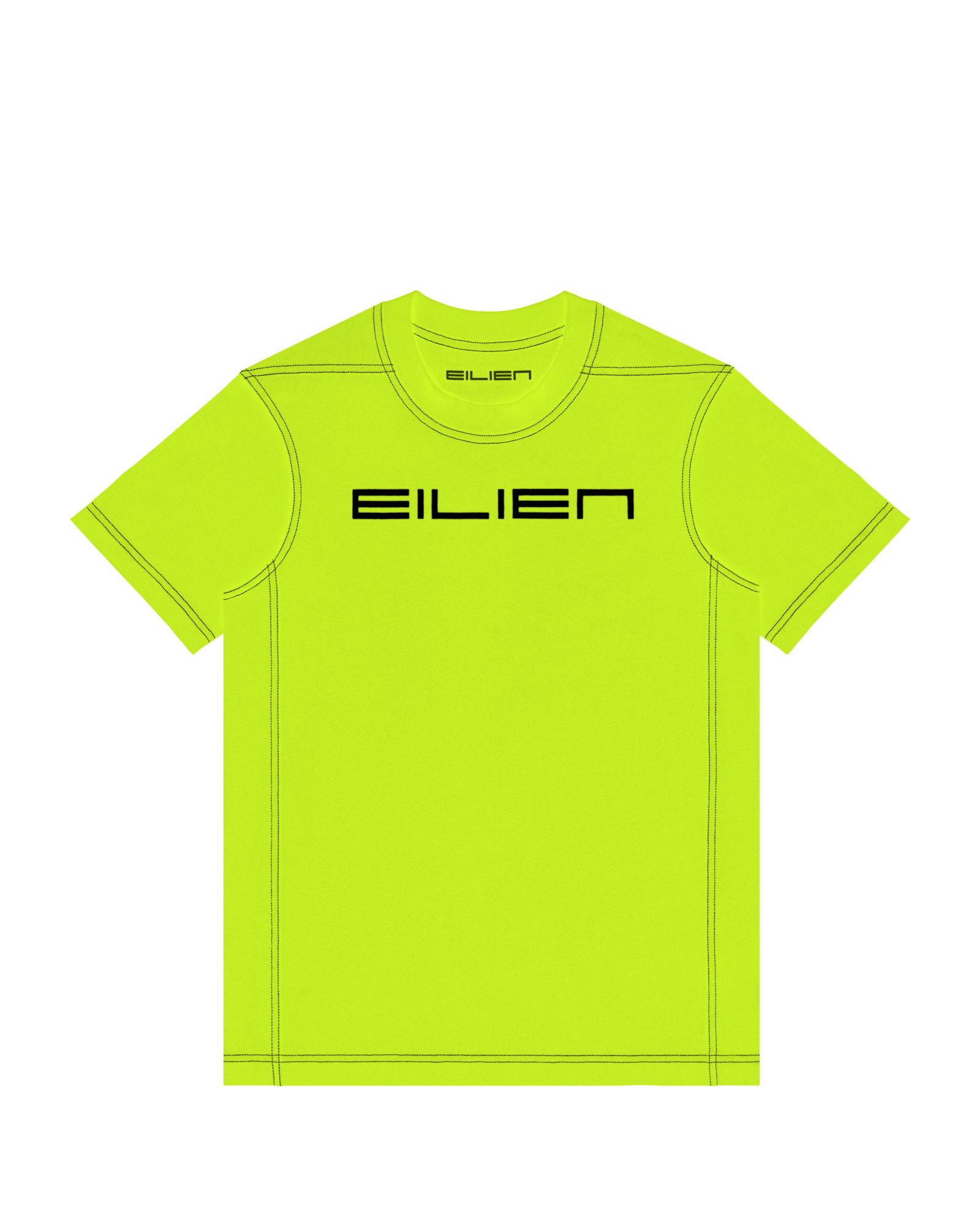 horizontal shoulder seams and offset side seams create a framework for graphic prints; contrast topstitching; wide rib knit collar; matte screen print.