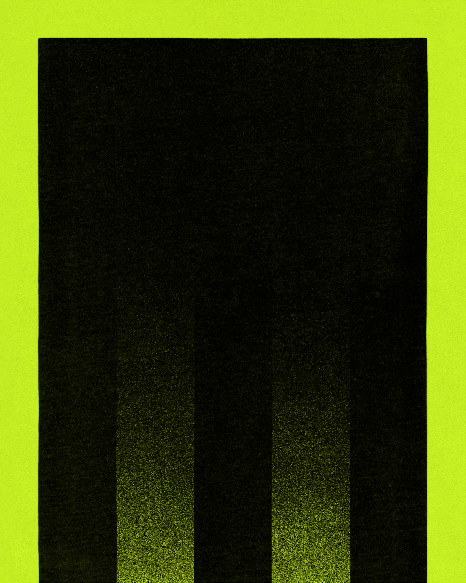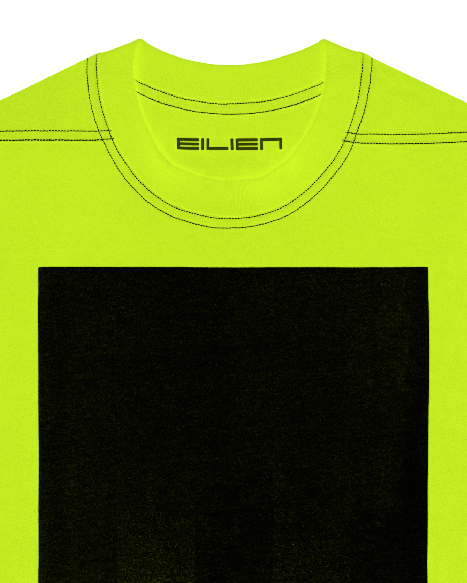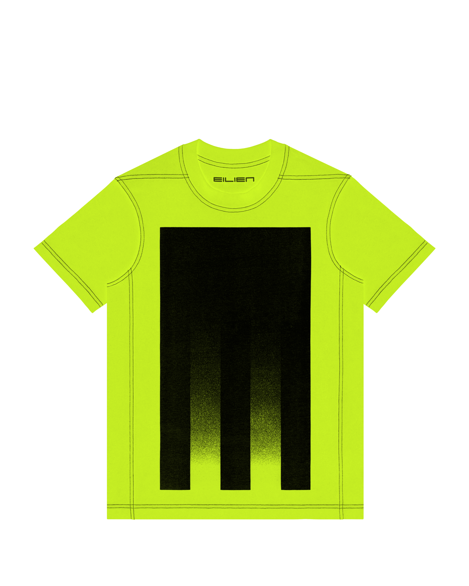 horizontal shoulder seams and offset side seams create a framework for graphic prints; contrast topstitching; wide rib knit collar; matte screen print.