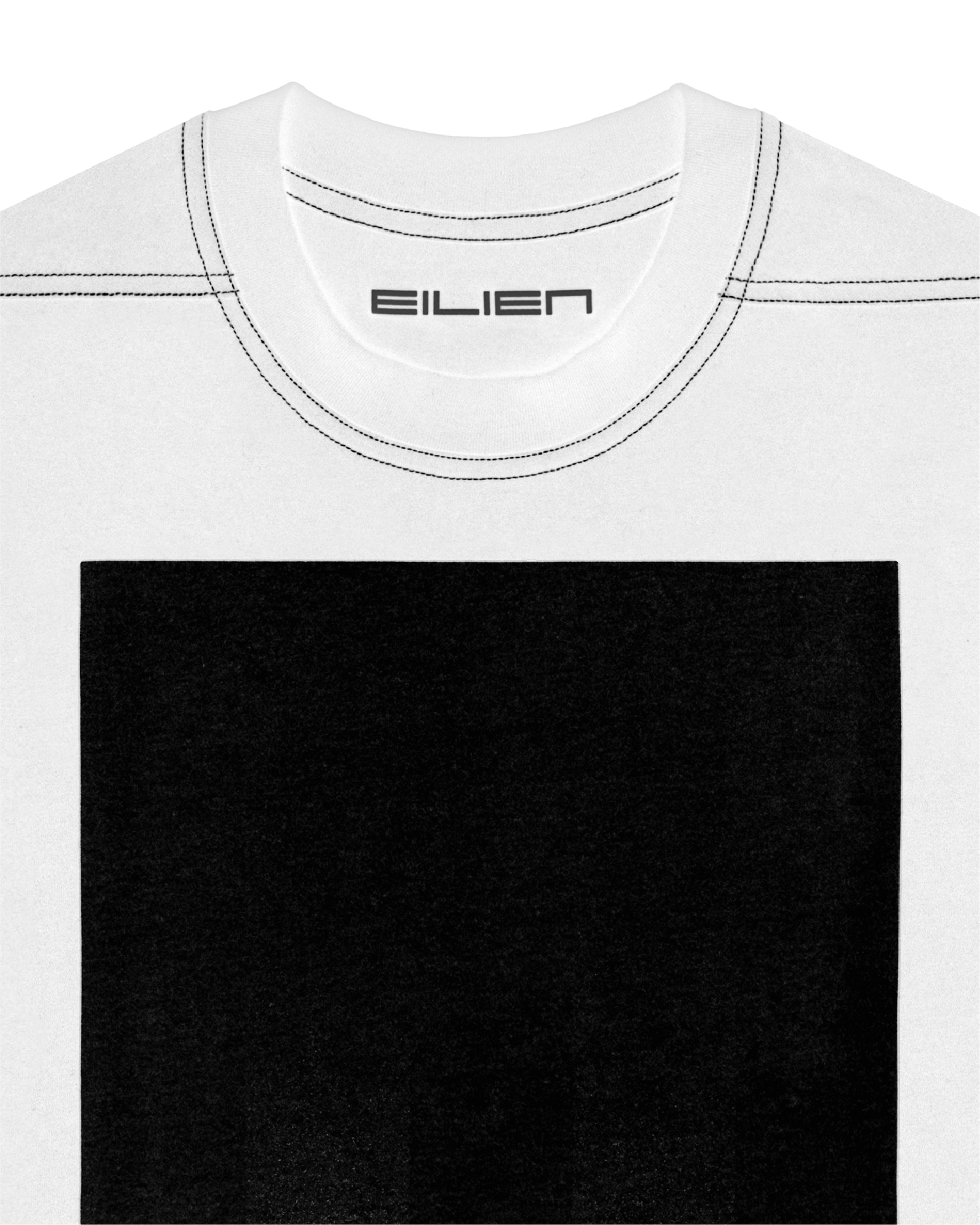 horizontal shoulder seams and offset side seams create a framework for graphic prints; contrast topstitching; wide rib knit collar; matte screen print.