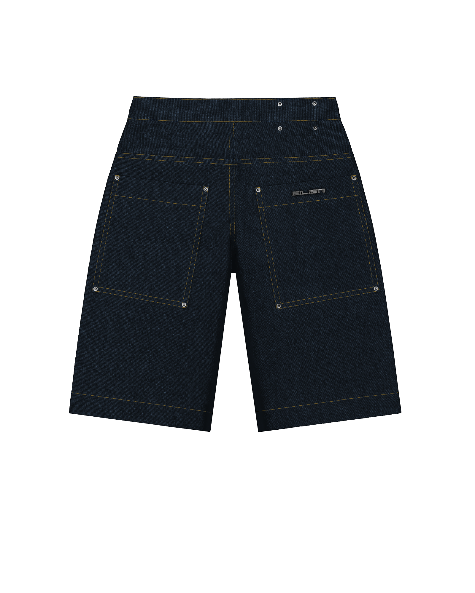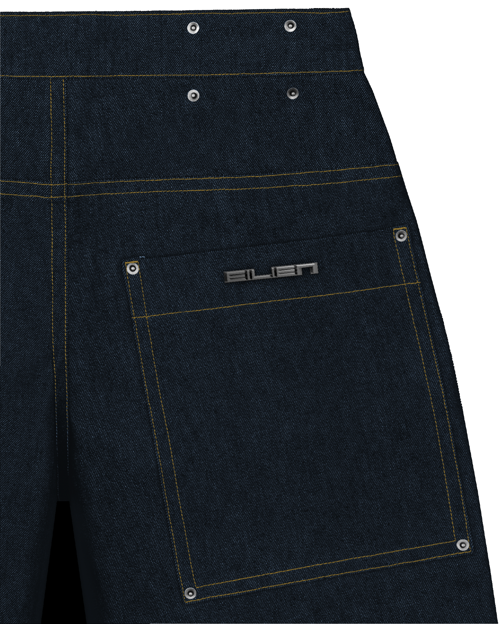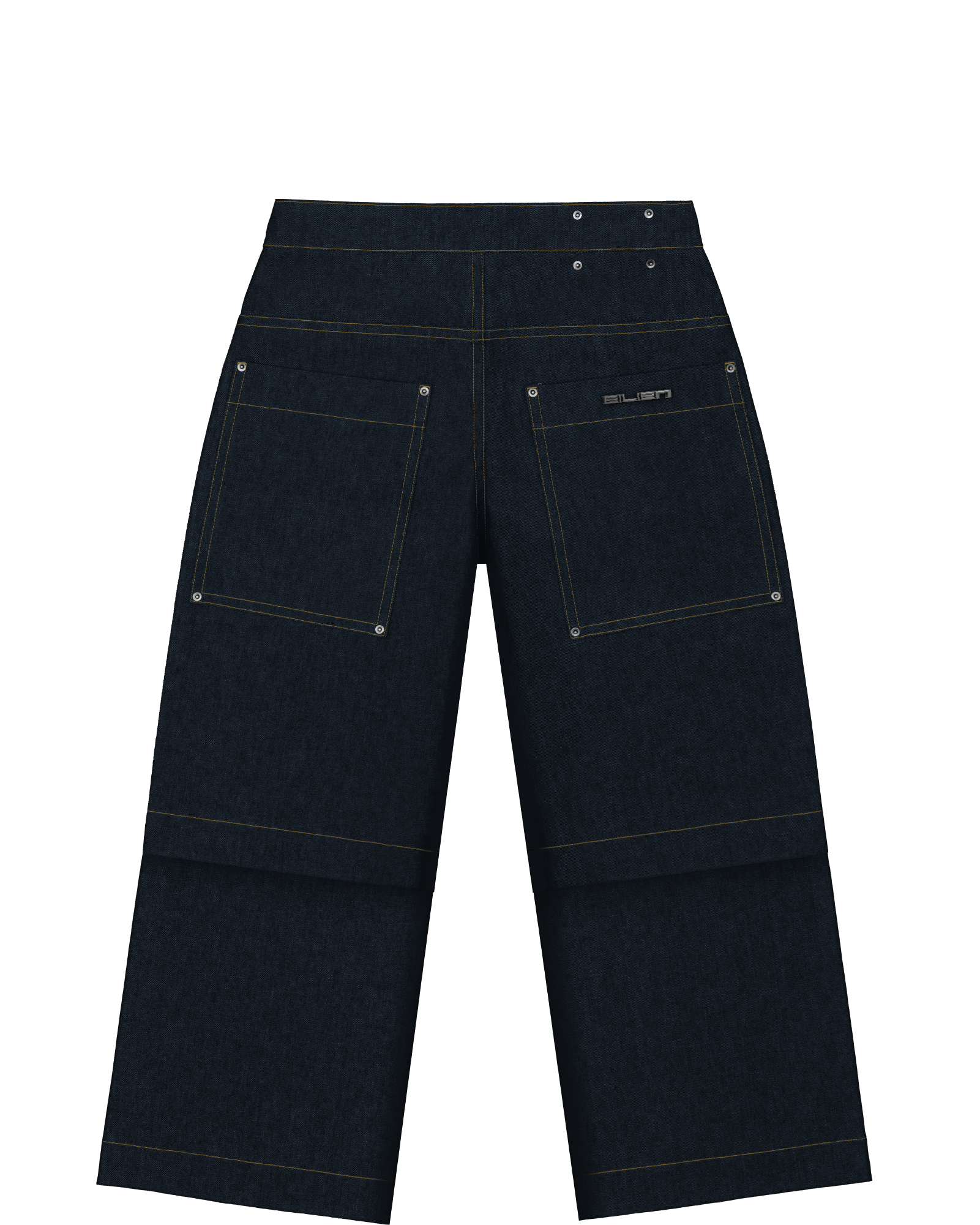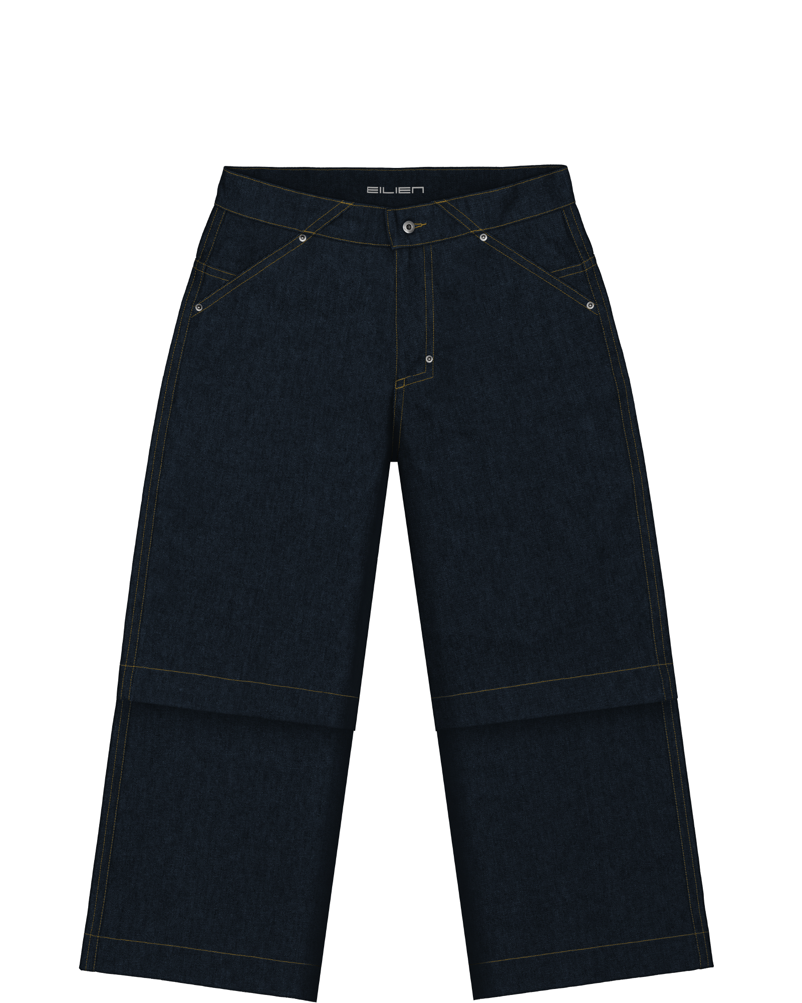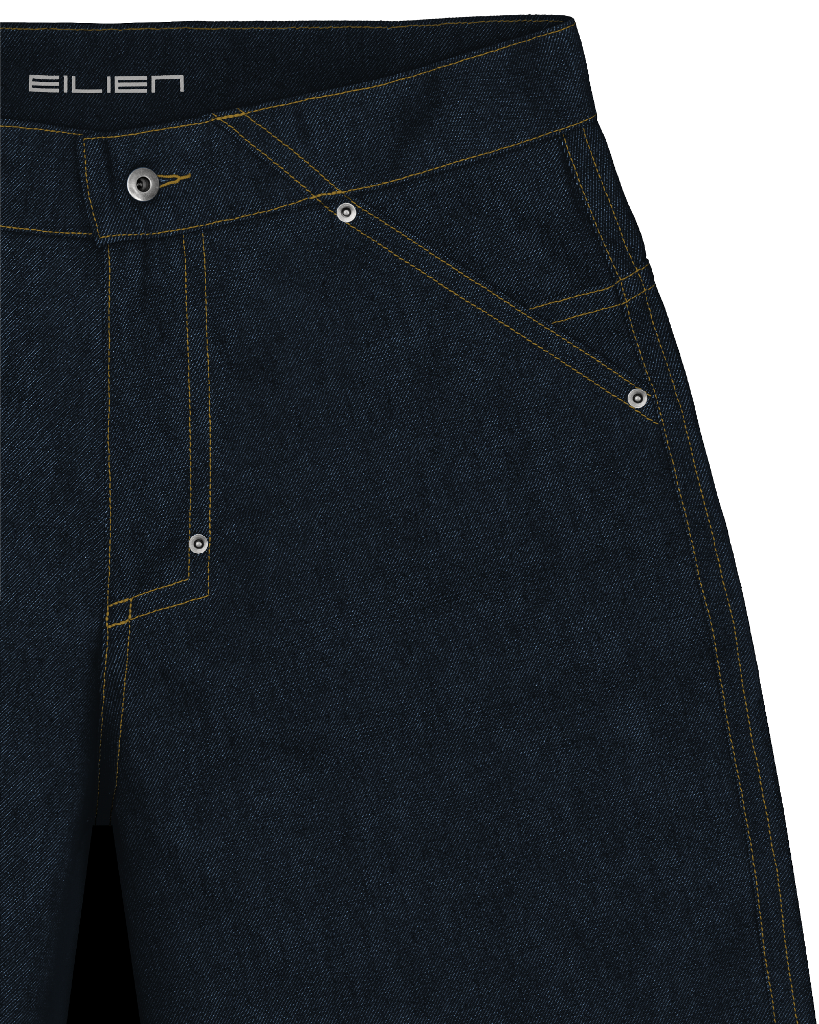 straight, continuous seams; wide contrast topstitching; straight waistband with hidden belt tunnel (maximum belt width: 1.25" / 32 MM); button fly; 6 pockets: diagnal set-in pockets in front, left and right side coin pockets, rectangular patch pockets in back; detachable leg extension with hidden zipper closure; metal hardware (antique silver finish) throughout: hollow shank buttons at center front; rivets on front and back pockets and back waistband; EILIEN nameplate pin included.