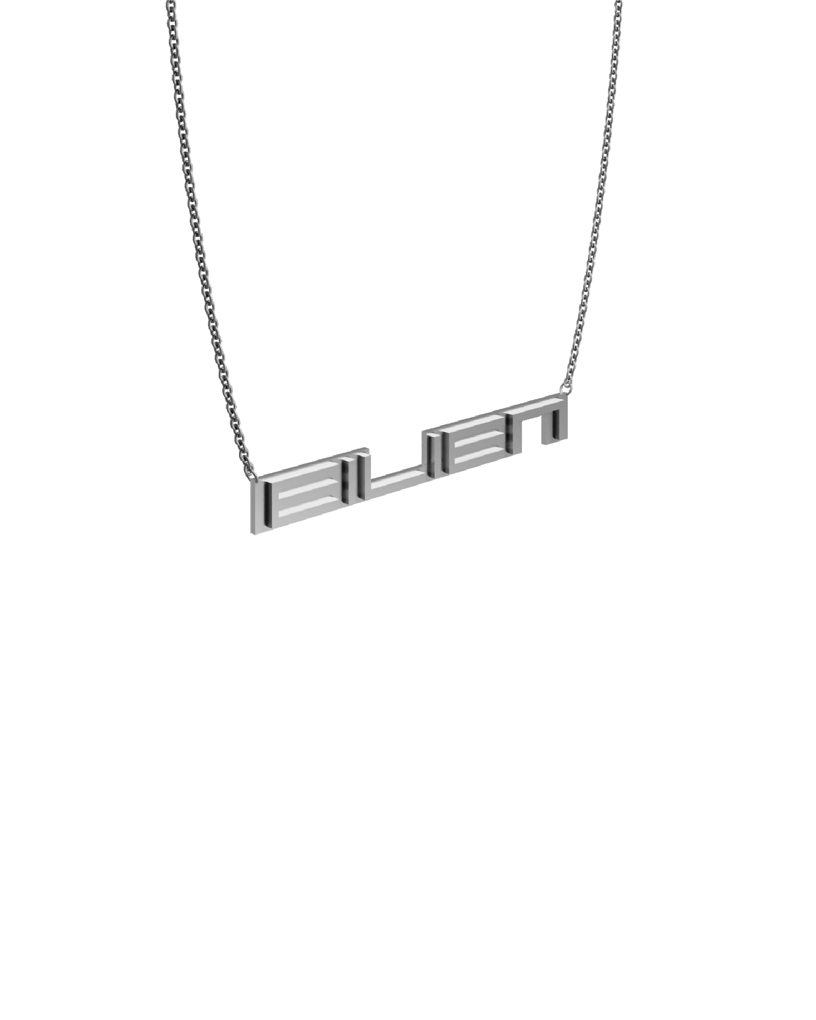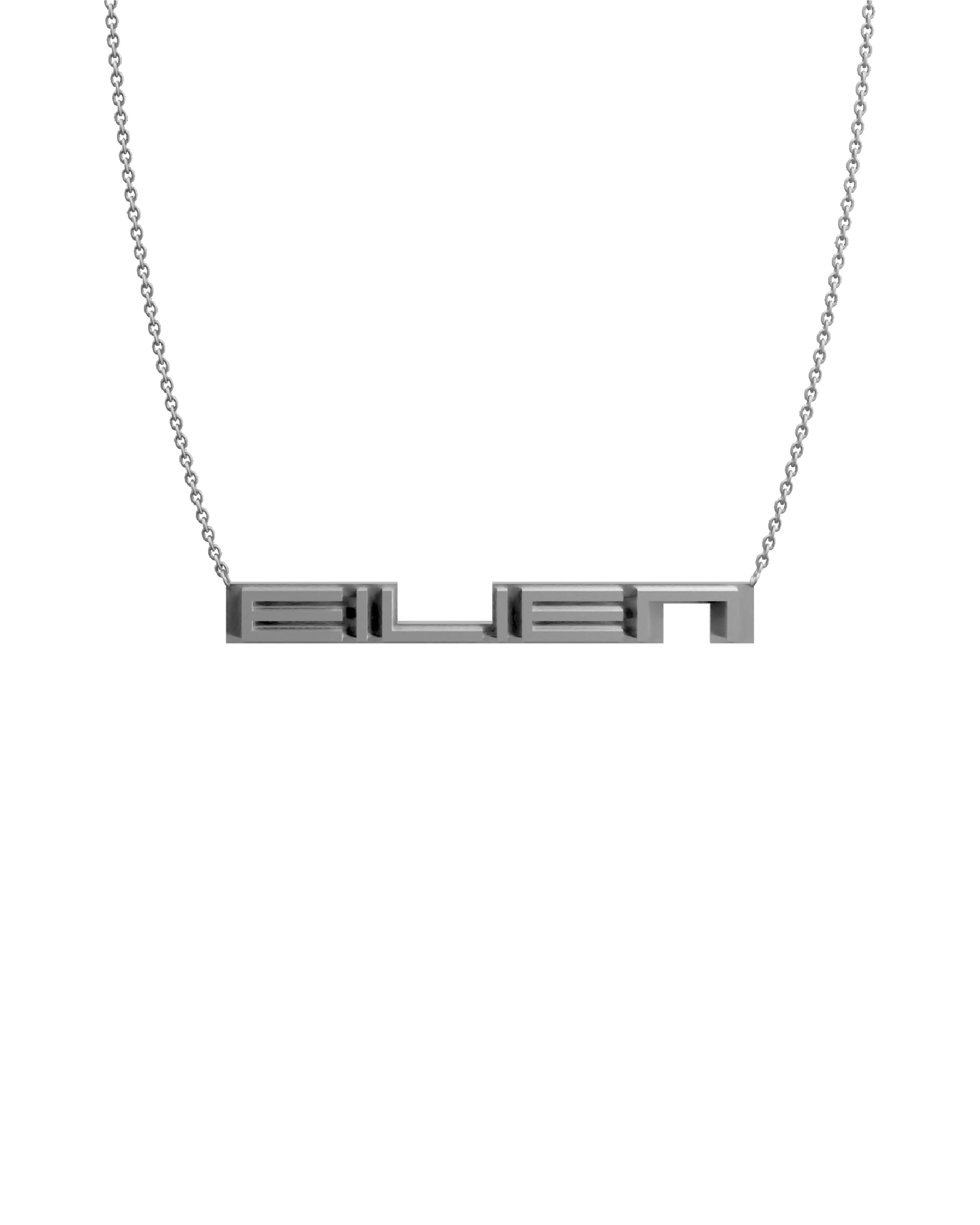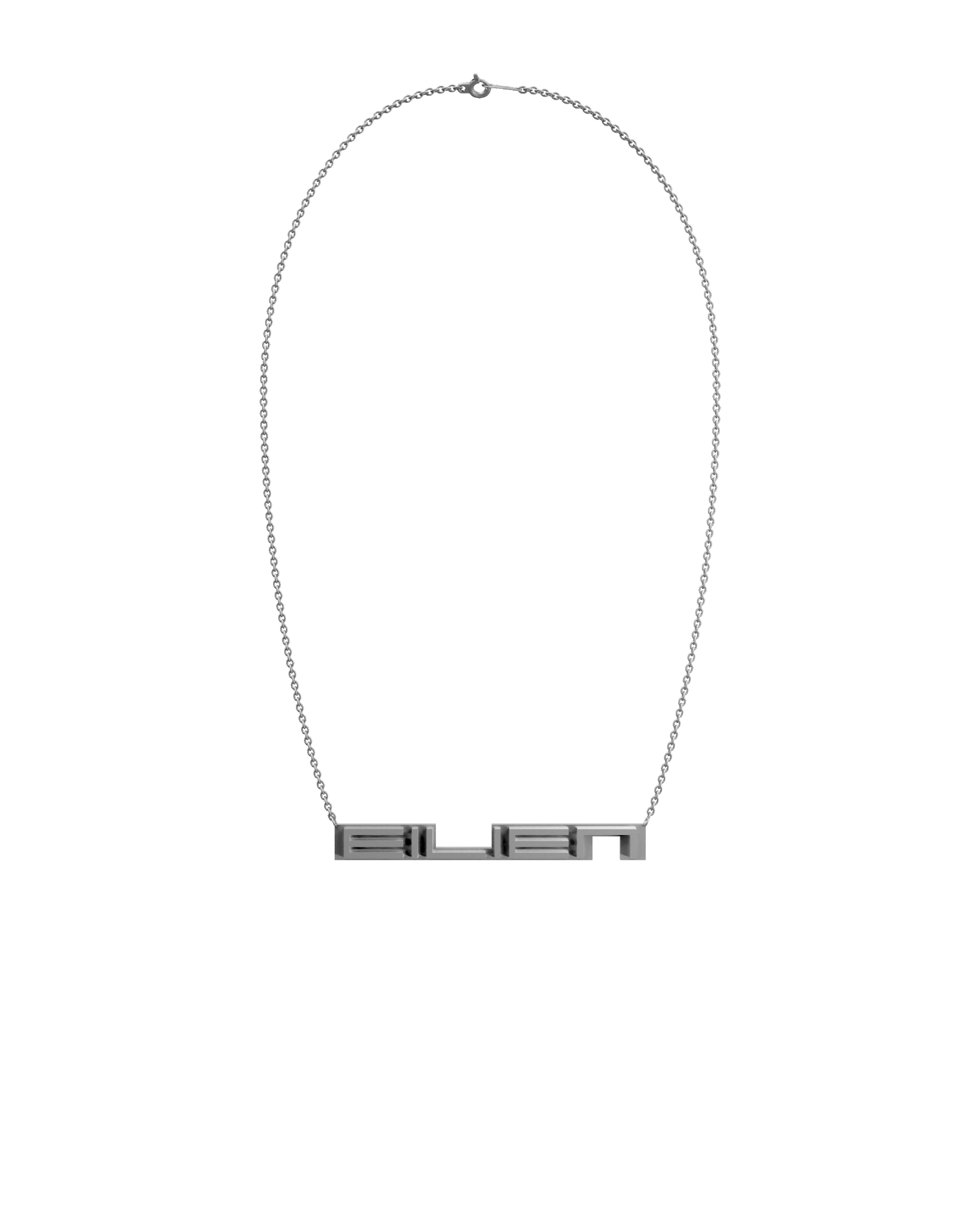 EILIEN nameplate pendant; solid cast bronze with palladium plating (matte silver finish); 20" chain with spring ring clasp; sold individually.